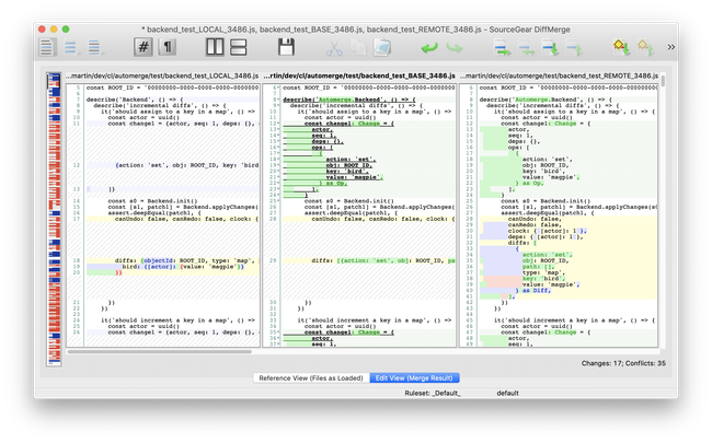 In Git and other version control systems, several people may modify the same file in different commits. Combining those changes often results in merge conflicts, which can be resolved using specialized tools (such as DiffMerge, shown here). These tools are primarily designed for line-oriented text files such as source code; for other file formats, tool support is much weaker.