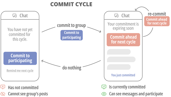 Figure 1.The commitment mechanism and interface: when users are not committed to a group, they do not have the privileges of membership. They must commit to participating in the group in order to join, and renew this commitment on a regular basis to stay.