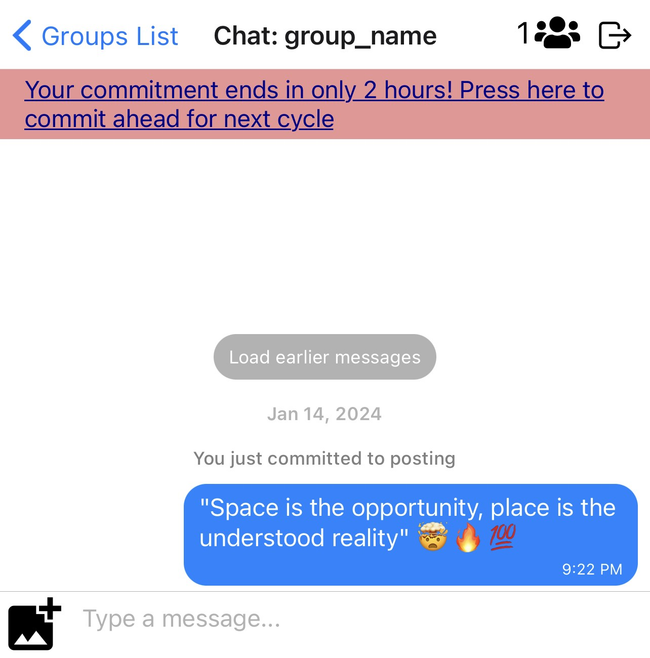 We instantiate this design in a mobile group chat platform called Commit. Group chats are a popular mechanism for online groups (Haigney, 2024), and Commit’s design mirrors common group messaging platforms such as WhatsApp or WeChat with a few differences to incorporate the mechanism of commitment. First, the group’s discussion is not visible until a member makes a commitment to participate in the group. Each member’s commitment, made visible in the group’s main feed, lasts by default a few days in exchange for the promise to contribute. Banners and notifications remind the user to fulfill their commitment or recommit for the next cycle when the period is ending and they have not done so. The application does not force participants to fulfill their commitment, nor does it broadcast whether they have done so: we rely on social (dis)approbation as more effective than technical consequences, especially since many groups can survive a little bit of free-riding.
