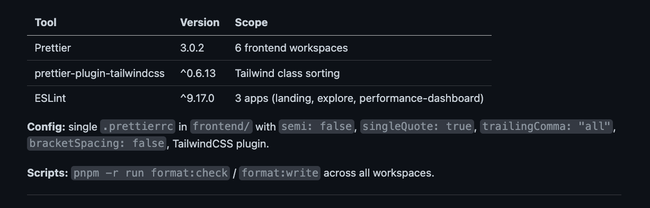 Config: single .prettierrc in frontend/ with semi: false, singleQuote: true, trailingComma: "all", bracketSpacing: false, TailwindCSS plugin.
