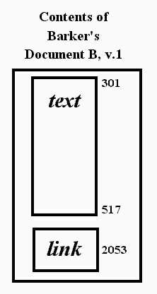 Now along comes a second author Barker, who publishes document B, version 1. The text contents of document B v.1 are registered as 217 consecutive bytes with permanent addresses 301 to 517, also an unbroken stretch of content bytes.
