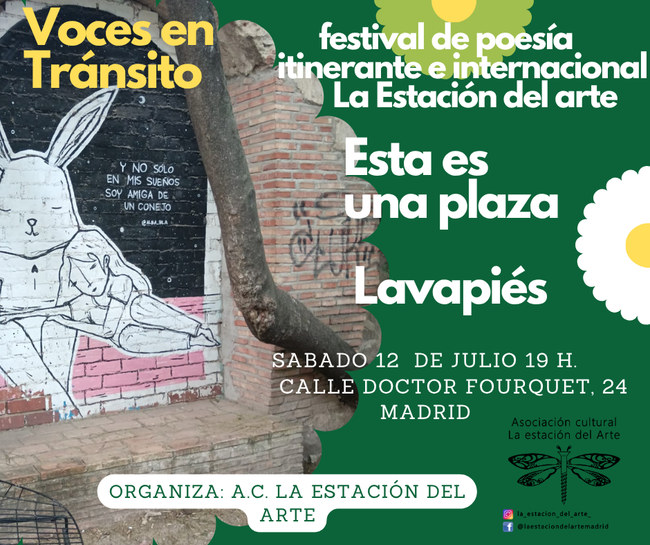 El próximo viernes, 12 de julio, a las 19 horas, el espacio vecinal Esta es una Plaza acoge un encuentro poético abierto, libre y diverso: “Voces en Tránsito – Poesía Itinerante”. Este evento se inspira en el Festival Internacional e Itinerante de Poesía promovido por la Asociación Cultural La Estación del Arte, un proyecto que desde 2020 recorre ciudades de España e Italia llevando la poesía a distintos territorios, espacios y comunidades. La parada en Madrid busca revivir la esencia del festival: la palabra en movimiento, el encuentro entre voces diversas y el compromiso con una cultura viva, libre y compartida. En Esta es una Plaza se darán cita poetas, vecinas y visitantes para compartir sus voces en una propuesta de micrófono abierto. La dirección artística del evento está a cargo de Inés Negro, cofundadora del festival junto a Desirée Monfreda, también fundadora y jurado del certamen. La producción está coordinada por el productor Christopher Reyna. Dónde: Esta es una Plaza, calle Doctor Fourquet, 24 Cuándo: viernes, 12 de julio, a las 19 horas