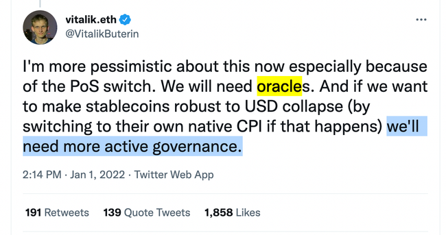 And even Ethereum, which is the most successful trustless smartchain, relies on some centralized entities. As the founder of Ethereum points out, trusted entities (called "oracles") are required to maintain a functional ecosystem. In this case, the price of USD must be observed to create stablecoins.