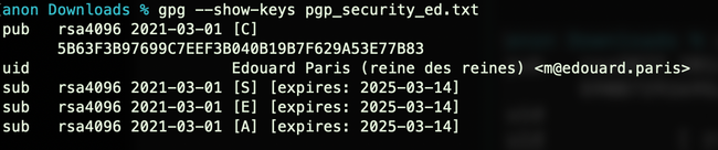 Si escribes en Terminal "gpg --show-keys" + el archivo, que usaste para incluir la key del desarrollador, obtenemos su email y fingerprint.