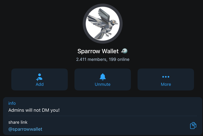 También hay otras maneras como la de acudir, con el objetivo de recibir información, a un grupo de Telegram o un perfil de X de un software wallet sin saber que son fraudulentos. Vamos a tomar el ejemplo de Sparrow wallet, actualmente el mejor software wallet de ordenador, que hace de interfaz gráfico para carteras frías y calientes. En Telegram solo existe un grupo oficial, el de https://t.me/sparrowwallet