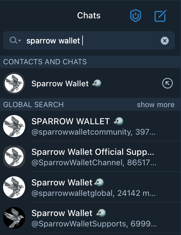 Si acudes al buscador de Telegram al poner Sparrow wallet ves esto: