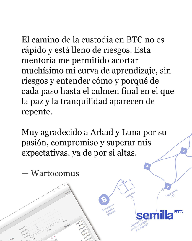 "El camino de la custodia en BTC no es rápido y está lleno de riesgos. Esta mentoría me permitido acortar muchísimo mi curva de aprendizaje, sin riesgos y entender como y porque de cada paso hasta el culmen final en el que la paz y la tranquilidad aparecen de repente. Muy agradecido a Arkad y Luna por su pasión, compromiso y superar mis expectativas, ya de por si altas."