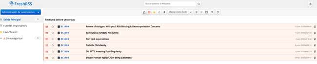 Lector de noticias por RSSRSS (Really Simple Syndication o Rich Site Summary) es un formato para distribuir contenido que permite a los usuarios recibir actualizaciones automáticas de sitios web sin tener que visitarlos directamente. Funciona mediante archivos XML que contienen información sobre las últimas publicaciones, como títulos, resúmenes y enlaces. Esto facilita que los lectores se mantengan informados sobre noticias, blogs o podcasts de forma centralizada y en tiempo real utilizando aplicaciones o lectores RSS, lo que ahorra tiempo y mejora la eficiencia en la gestión de la información. Este sistema es ampliamente utilizado porque permite a los usuarios suscribirse a múltiples fuentes y verlas en un único lugar. Además, los creadores de contenido se benefician al poder difundir sus actualizaciones automáticamente a sus seguidores. El artículo también menciona un "stack" personal para usar RSS, que incluye FreshRSS como servidor autoalojado y NetNewsWire como aplicación móvil para leer las noticias cómodamente.