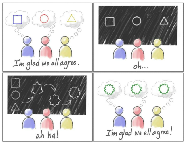 Building a shared understanding. Most of the time, each team member has a different idea of every feature, concept, definition, user, and user goal we are building. We need to develop a common understanding quickly.