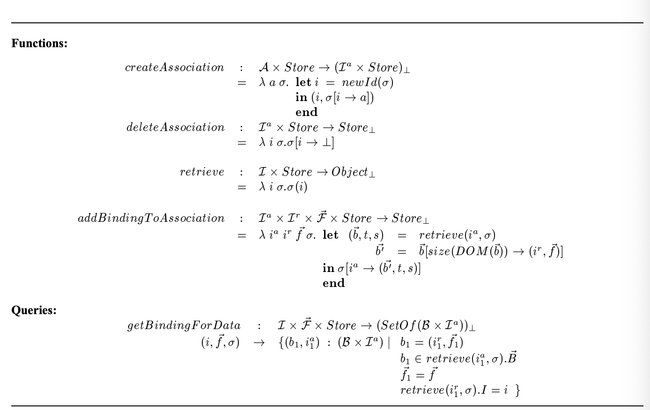 Figure 4 displays some of the operations that are permitted on the data: for instance, createAssociation expects an association and a store, and if successful, returns a new identifier for the association, and an updated store, containing a mapping between the identifier and the association. As a result, retrieving an object associated with a valid identifier is performed by applying the store to the identifier. Along the same lines, adding a binding to an association (addBindingToAssociation) consists of retrieving the association and storing a new association with a new binding in the binding vector.