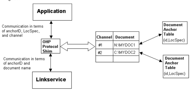 The OHP protocol shim should be written to handle the storage and delivery of the anchor table for each document. Thus when the GetAnchorTable message is received by the protocol shim, it will retrieve the correct file (which it will identify from the channel information). The linkservice itself will never see this message. The viewer will communicate to the linkservice about anchors in terms of the anchorID and the channel (and perhaps the LocSpec), and the shim will convert this into messages about the anchorID and the document name, as shown in figure 3.