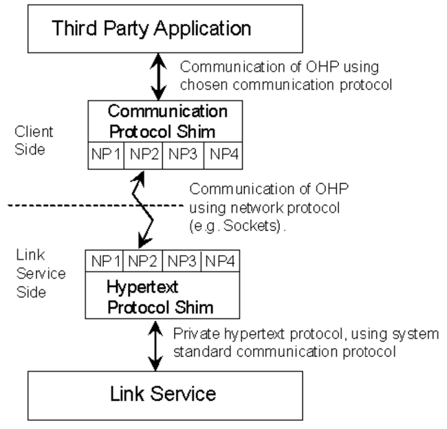 All systems designers have developed their own private protocols for communicating with the link service, and these protocols are so deeply buried into the system code that in general it would involve a major re- implementation to rewrite the system to adhere to some new, standard protocol. However, the topics of these communication are essentially similar and it should quite possible to abstract a common set of messages. We suggest that the difference between different system protocols could be resolved if each system produced a protocol shim which would sit between the application and the link service as shown in figure 1.