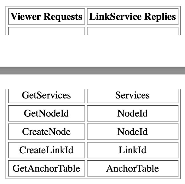The "GetServices" message is to be sent from Viewer to LinkService in order to know which services are available. The LinkService has to answer this request by a "Services" message. Services are defined by a description and a service name.