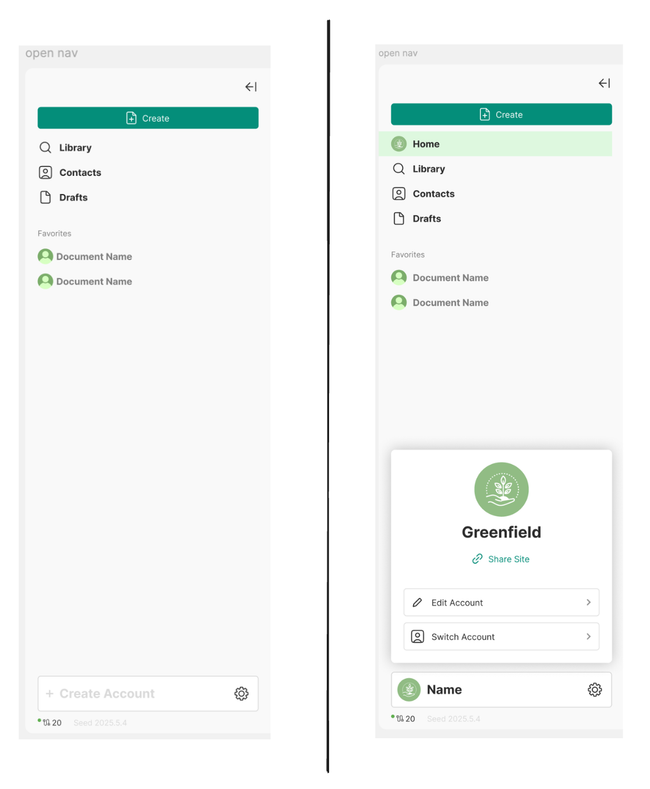 The Sidebar is the primary navigation element in Seed. It provides a persistent, context-aware interface for accessing core app functionality, user accounts, and favorite sites. Designed for clarity and speed, the Sidebar enables users to move seamlessly between creation, navigation, and collaboration.
