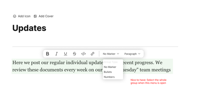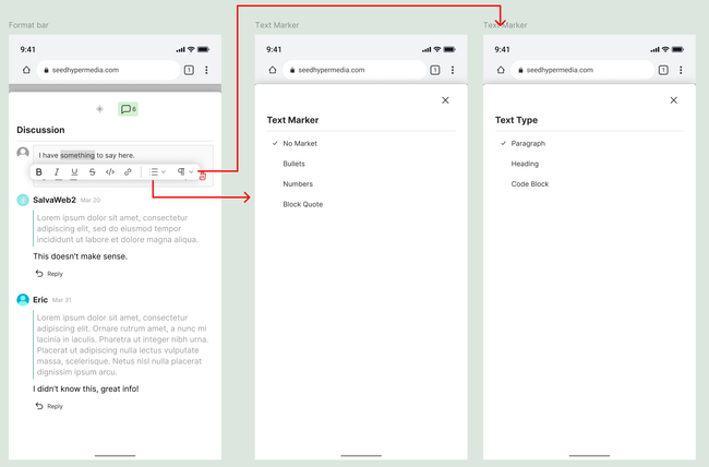 For mobile we can change the worded buttons to icon buttons and display this dropdown in the same interaction as we do the / Menu. (Notion was used as a reference for this)