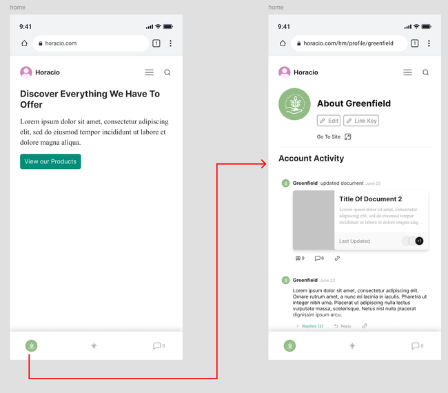 The Profile will display the information of the user in the header and a feed of all their activity happening though out seed hypermedia. They will also see a button to change their settings.