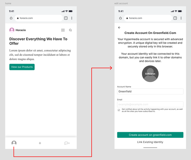 The pop up will give the user two option either to create a new account if they don't have one in that domain or to link an existing identity that they have on the app to secure there web keys. If the user has the app already downloaded it will provide the flow along side the app to link the profiles to a single identity, if not, it will recommend you download the app to maintain your profile safe.