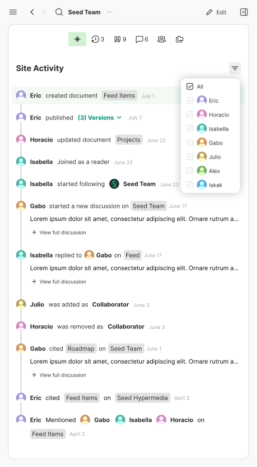 The items in the version history don't have constancy with the items in the all activity panel. The design should be unified so the element have consistency.