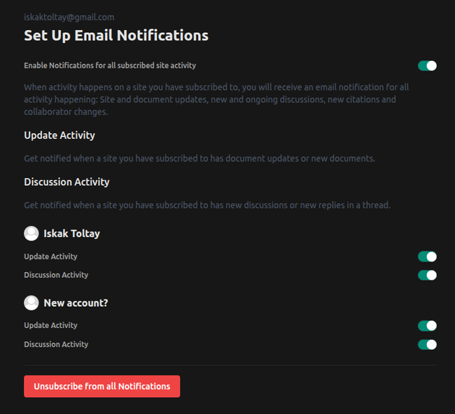 Users can subscribe to any site using just their email address. All subscribers receive notifications for all site activity