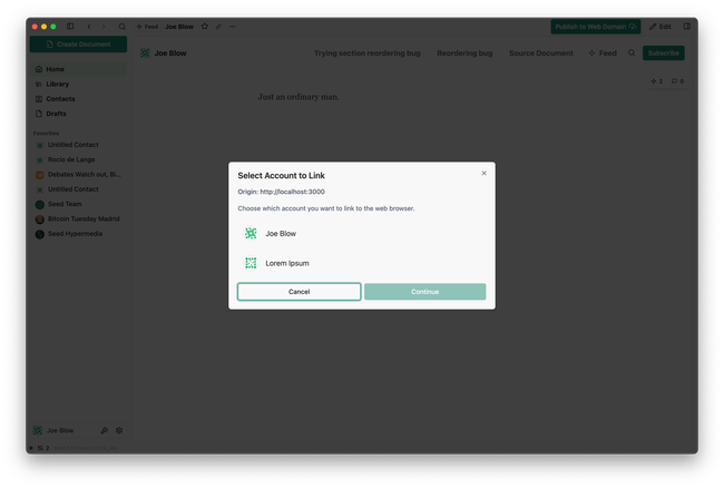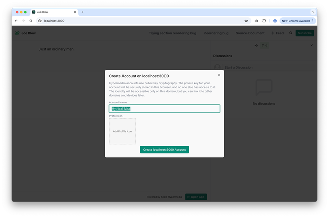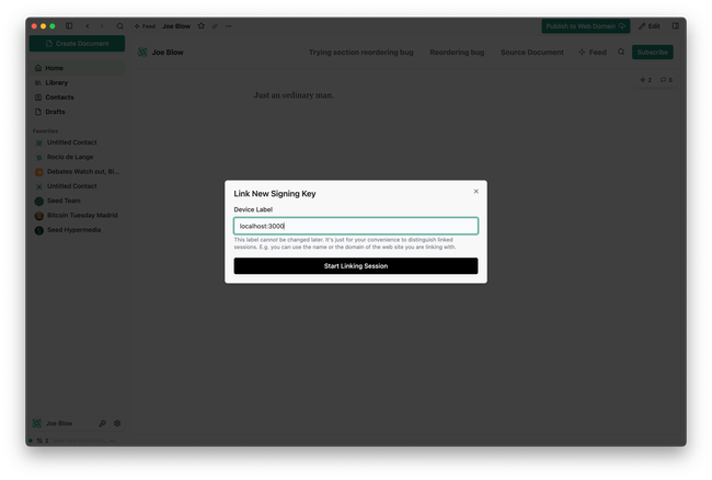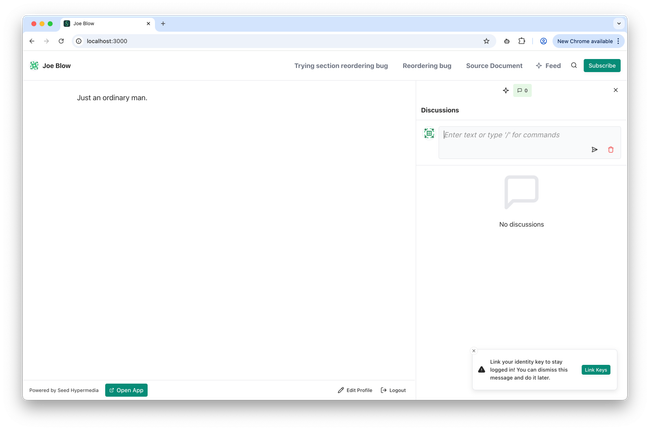 Some time ago we enabled the ability to create Web Crypto keys in the browser on all Seed sites, for users to be able to sign their comments right on the site they are visiting. Previously they were redirected to hyper.media because this was the only place where their identity key lived, as Web Crypto keys are tied to a single domain and can't be shared securely.