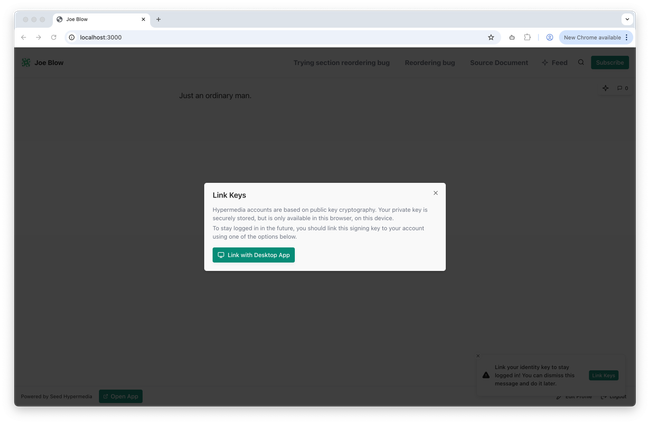 When user presses the "Link Keys" button they see a modal with explanations why this is necessary, and the options for linking. Right now there's only one option to use the Desktop App. Hopefully eventually we'll have a mobile app option in there, which increasingly becomes my most favorite option, compared to Passkeys or simple Web Crypto keys on hyper.media. A mobile identity wallet could bring so many benefits to our ecosystem, and it's probably the best option for users who care about self-sovereignty of their identity.